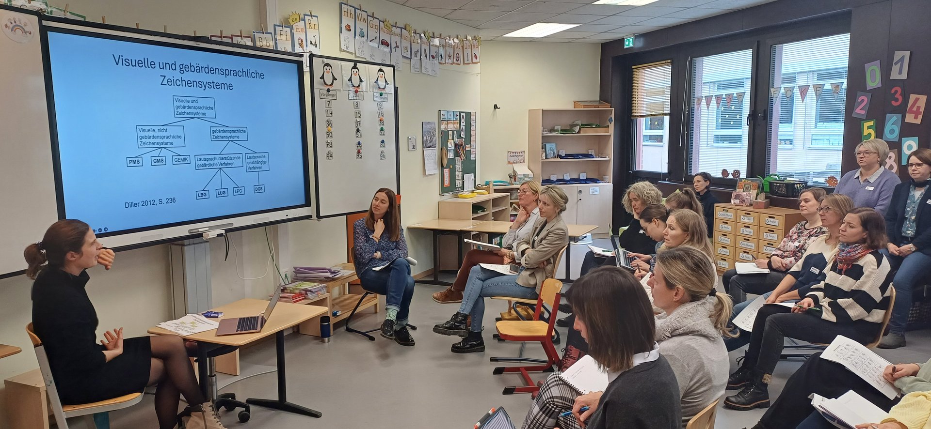 Am 16.11.2024 fand der Tag der Sprache erneut in Mainz an der Astrid-Lindgren-Schule statt. Thema in diesem Jahr war "Gebärden als Brücke zur Lautsprache". Die Referentinnen Jessica Bethke und Kristin Eisenbach, Lehrerinnen an der Landesschule für Gehörlose und Schwerhörige in Neuwied, stellten Fördermöglichkeiten zur Verbesserung des Sprachverständnisses durch Elemente der Körpersprache und Optimierung der Lernumgebung vor. Nach einem praxisorientierten Fachvortrag am Vormittag hatten die TeilnehmerInnen am Nachmittag